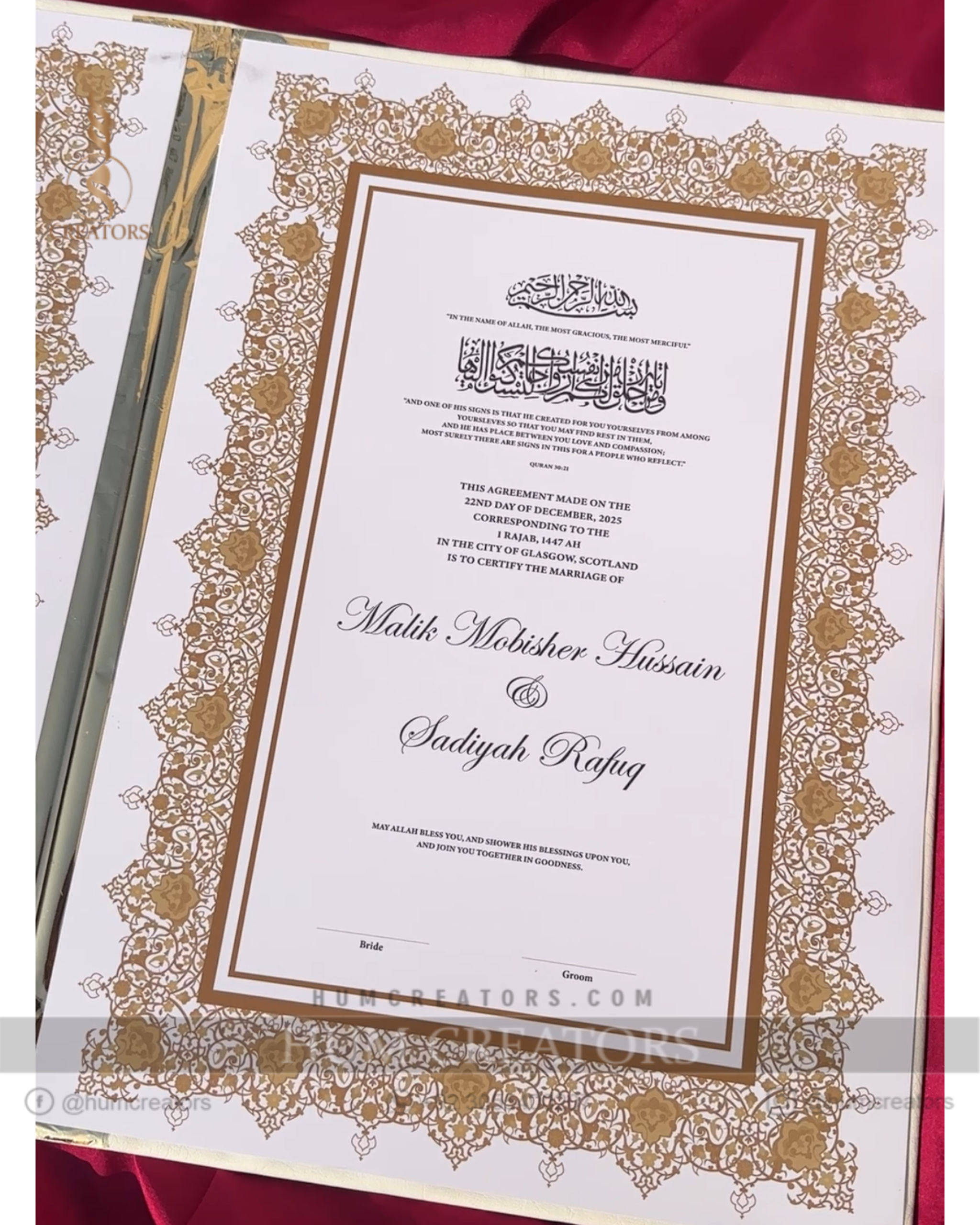 Thoughtfully crafted with a refined and elegant aesthetic, this booklet is perfect for documenting nikah details, signatures, duas, and cherished memories from your special day. Its premium finish and timeless design make it more than just a ceremony essential; it becomes a treasured keepsake that you can hold onto for years as a reminder of the beginning of your beautiful journey together.