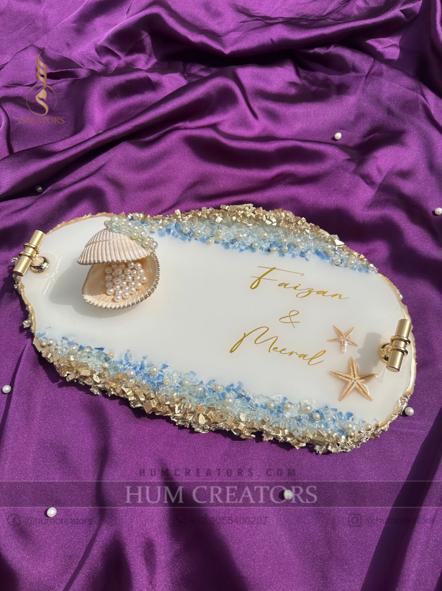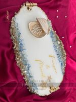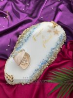 Bring the serene beauty of the ocean to your celebrations with our handcrafted ocean-themed resin platter a perfect blend of elegance, artistry, and personalization. Beautifully handcrafted with pearls, crushed glass, and starfish details. Finished with elegant golden handles, a seashell ring holder, and customized names